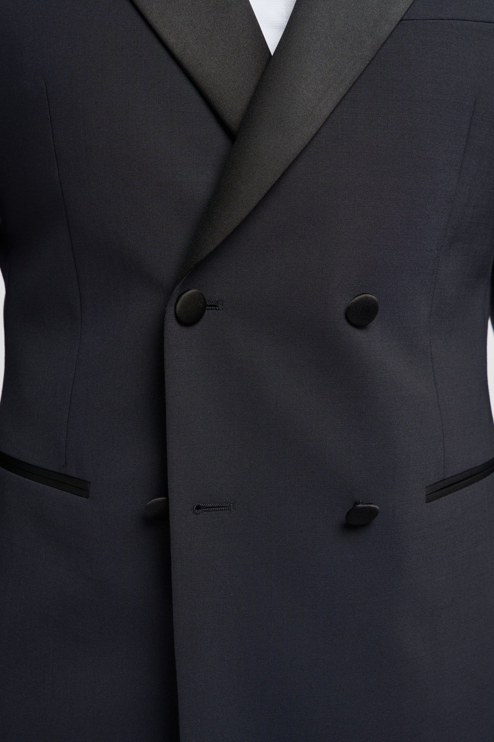 Command attention at any black-tie event with the Aspen Midnight Navy Double-Breasted Tuxedo, a modern reimagining of timeless formalwear. Cut from a luxurious wool blend and fully lined for comfort, this tailored tuxedo features a striking double-breasted silhouette with a satin shawl collar. Refined details - including flat pockets, a chest pocket, and four kissing cuff buttons - complete the design. Perfect for weddings, galas, and sophisticated evening occasions, this men’s black tie suit embodies elegance, confidence, and distinction.