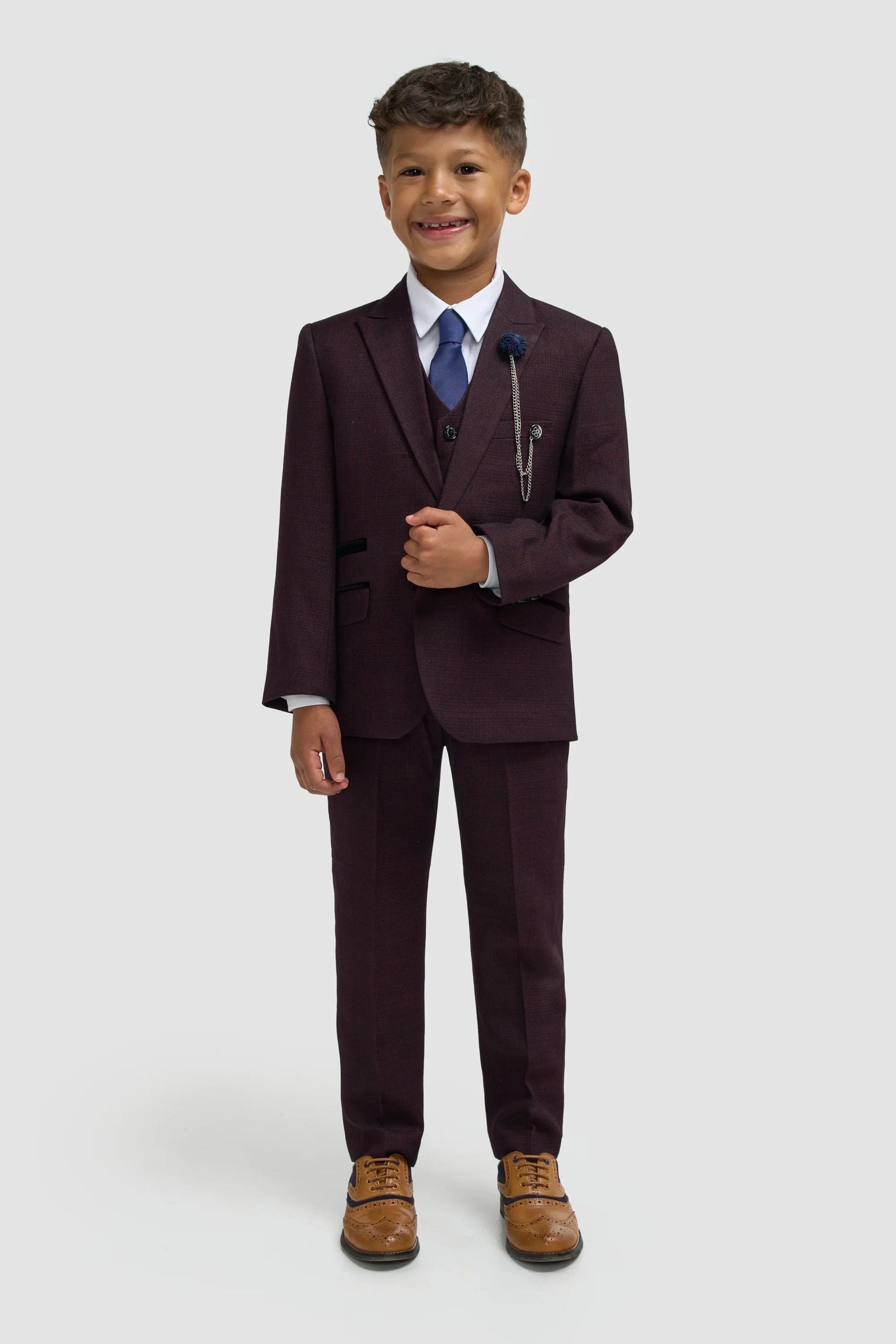 The Boys Caridi Wine Three Piece Suit is the perfect choice for young gentlemen who want to look sharp at weddings, parties, and special occasions. Designed in a deep wine colour, this boys formal suit includes a tailored blazer, smart waistcoat, and sleek trousers for a polished page boy or wedding guest look. Ideal for family celebrations, it’s also available as a matching father-and-son suit, making it a stylish option for coordinated outfits. Crafted with comfort and style in mind, this kids’ suit ensures he looks his best while feeling confident all day.