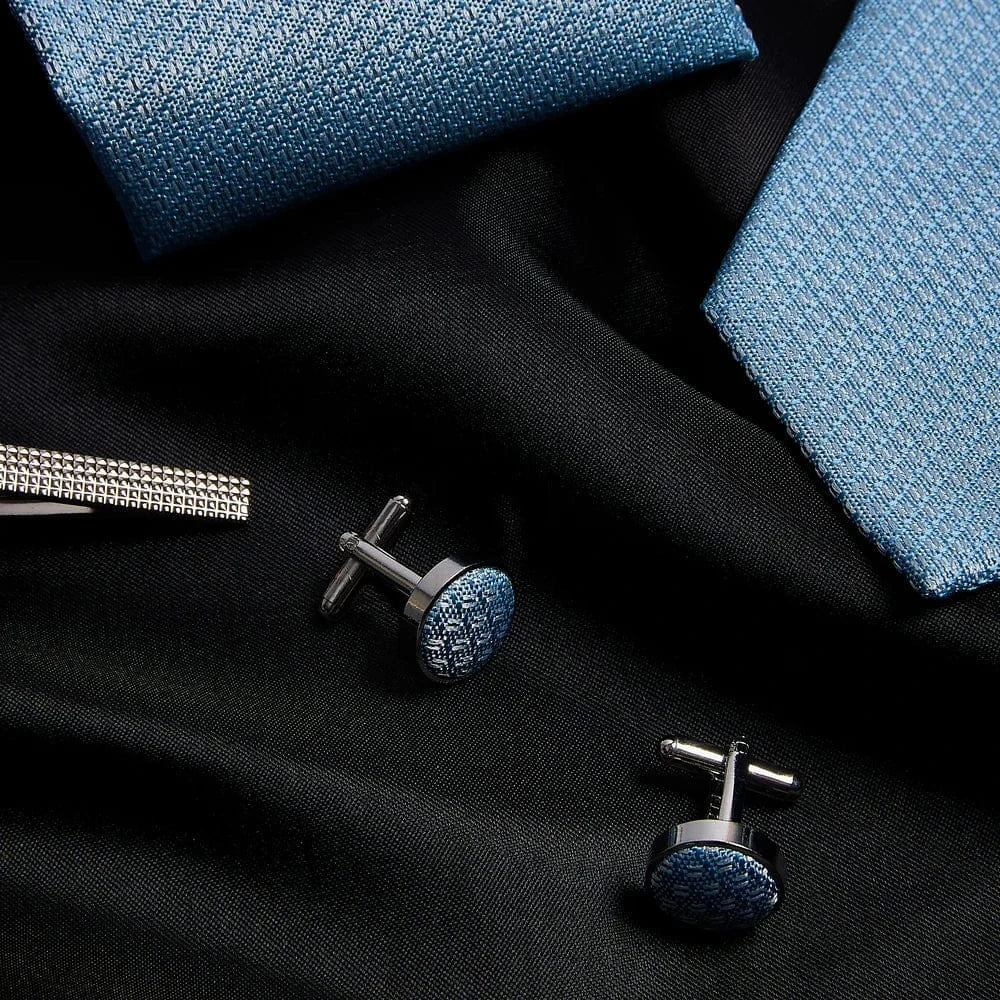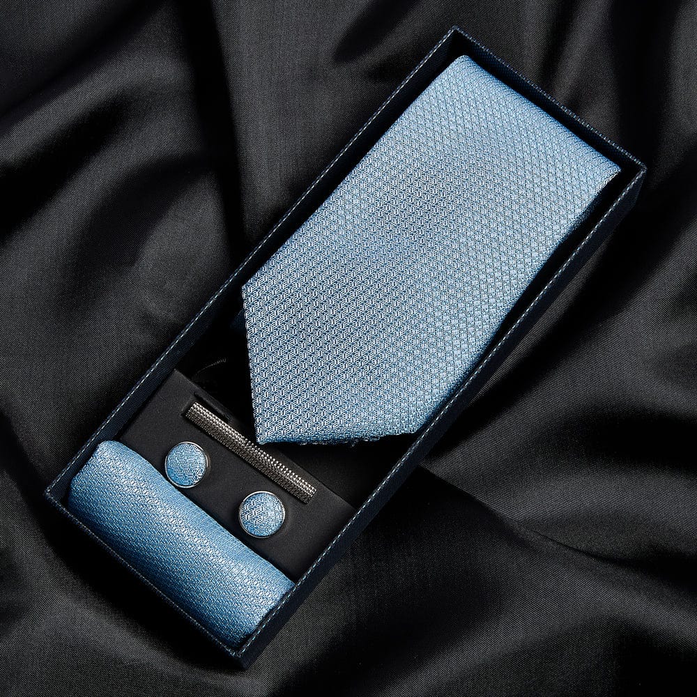 Step out in style with the Paul Andrew sky blue textured tie set. Featuring a refined tie, matching pocket square, and cufflinks, it’s perfect for weddings, groomsmen, and formal occasions.